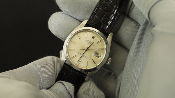 ロレックス  オイスターパーペチュアルデイト 1500 自動巻き Cal.1570 SS 革 社外尾錠(SS)シルバー文字盤 36mm 53番台(1977年)オーバーホール済み