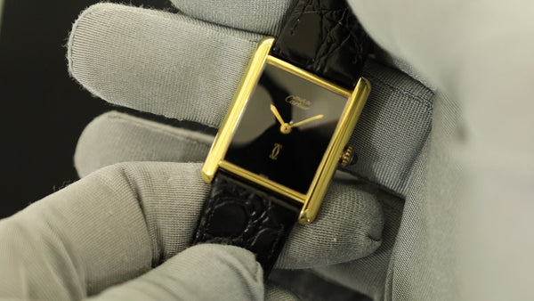 カルティエ マストタンク LM 590005 クォーツ Cal.90 SV925 革 純正Dバックル(GP)ブラック飛びローマン文字盤オーバーホール済み