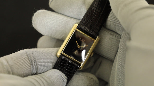 Cartier Must Tank SM Manual Winding Caliber - SV925 Leather Strap with Genuine GP Buckle, Onyx Dial, Circa 1976-Circa 1981, Overhauled