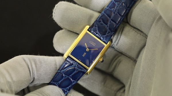 Cartier Must Tank LM Manual Winding Caliber 78-1 SV925 Leather Strap with Genuine GP Buckle, Lapis Lazuli Dial, Circa 1976-1981, Overhauled