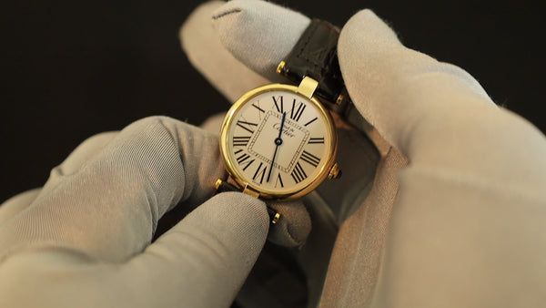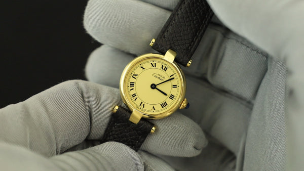 Cartier Must Vendôme VLC SM 18 Quartz Cal.81 SV925 Leather Strap with Genuine GP Buckle, Black Roman Dial, Box, Overhauled