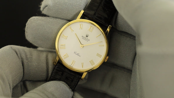 SOLD Rolex Cellini 5112 Manual winding Cal.1601 750 Leather Genuine buckle (750) White Roman dial 32mm E series (1990-1991) OverhauledRolex Cellini 5112 Manual winding Cal.1601 750 Leather Genuine buckle (750) White Roman dial 32mm E series (1990-1991) Overhauled