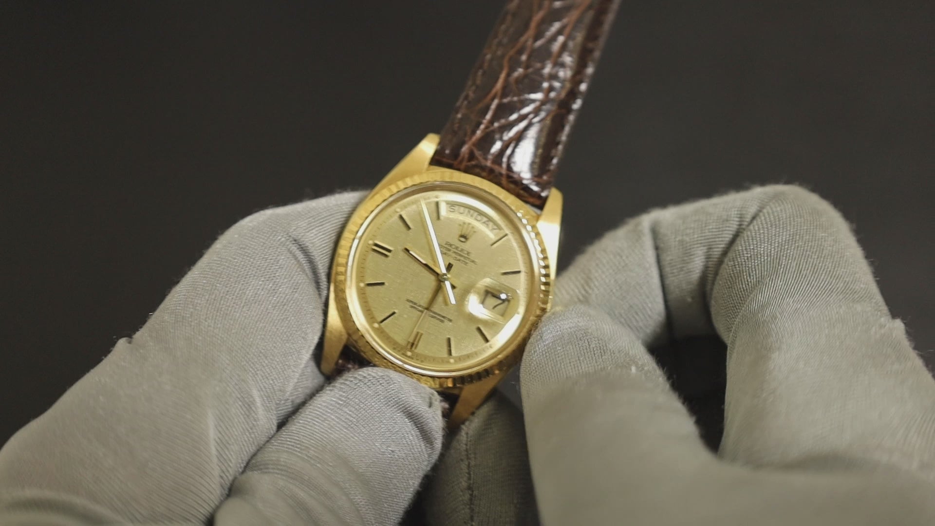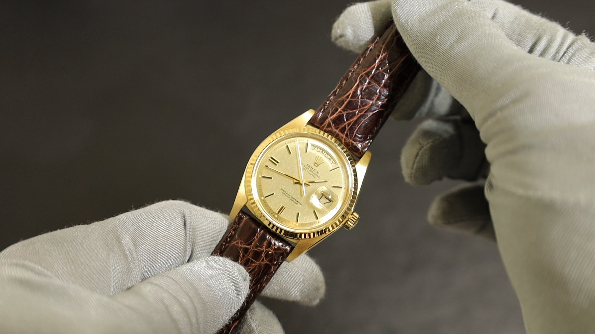 ロレックス デイデイト 1803 自動巻き Cal.1556 750YG 革 純正ピンバックル(GP)シグマダイアル シャンパン文字盤 34番台(1971年)オーバーホール済み