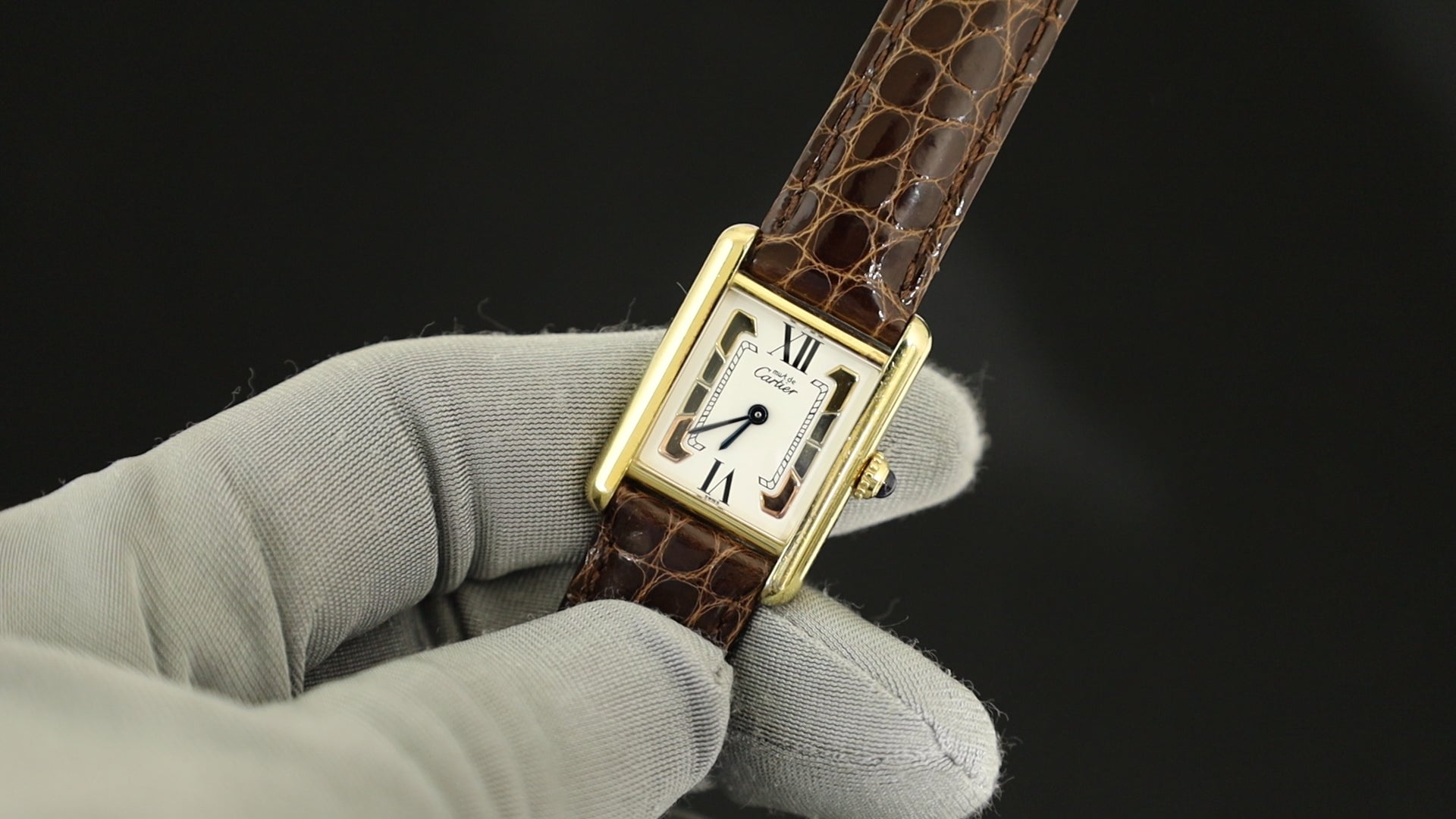Cartier Must Tank SM 5057001 Quartz Caliber 057 SV925 Leather Strap with Genuine D-Buckle (GP) Side Trinity Dial Circa 1982-Circa 1995 Overhauled