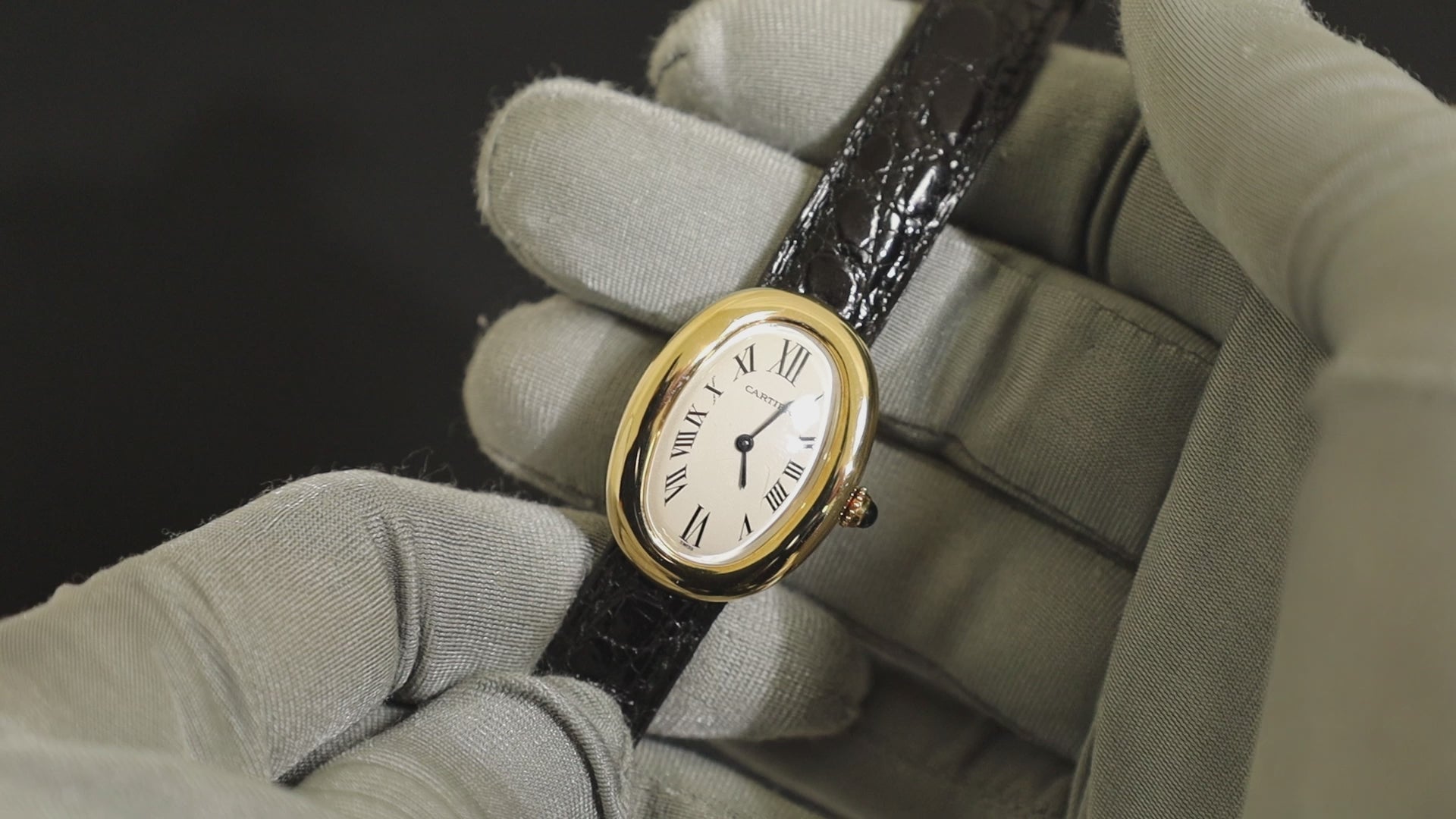 Cartier Baignoire SMW1506056 / 1952 Quartz Cal. 057 750YG Leather Genuine Pin Buckle (750YG) White Roman Dial Box Booklet Warranty (1995) Overhauled
