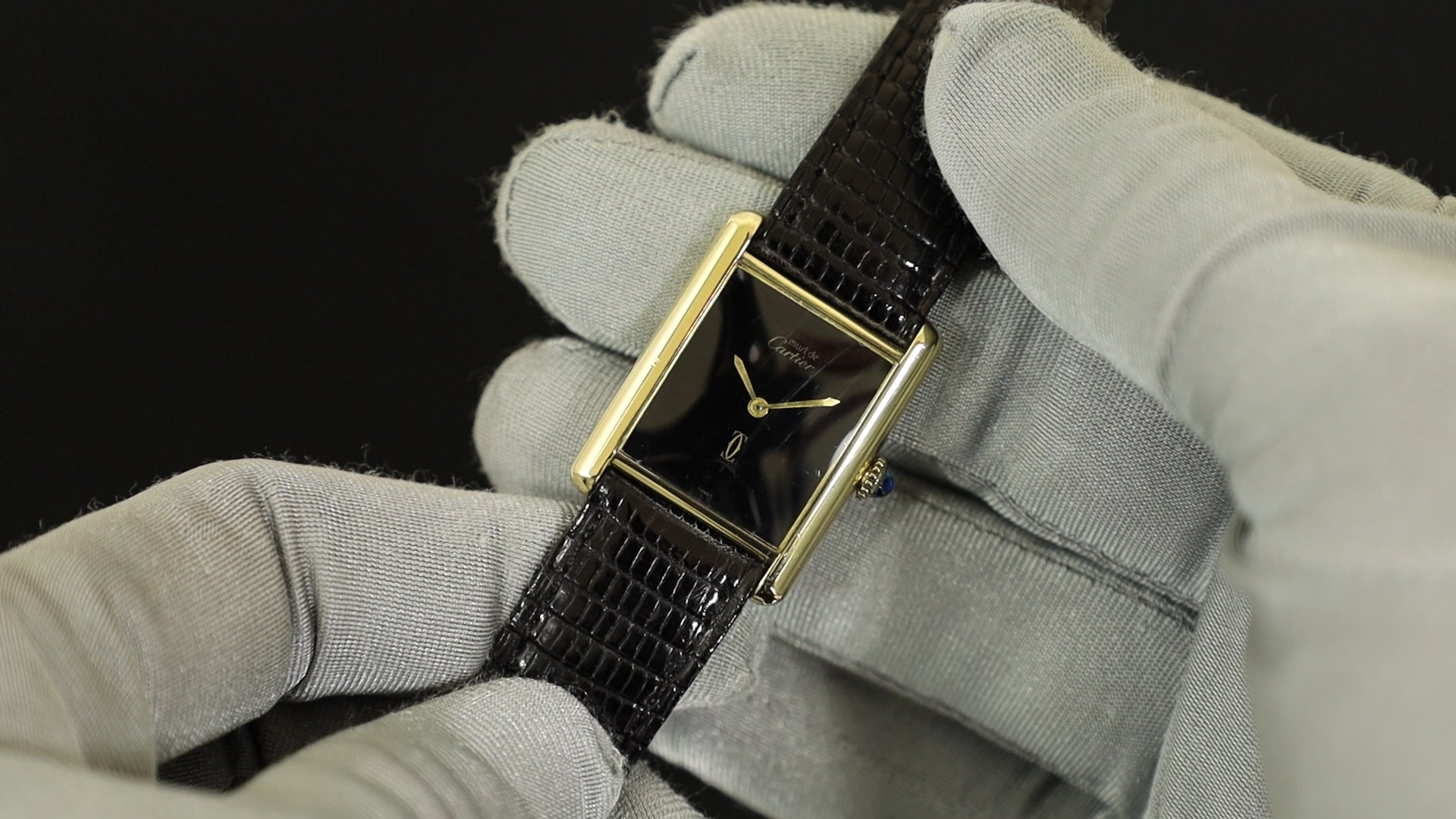 Cartier Must Tank LM, manual winding, Cal. 78-1, SV925, genuine leather strap, genuine buckle (GP), onyx dial, circa 1976-1981, overhauled.