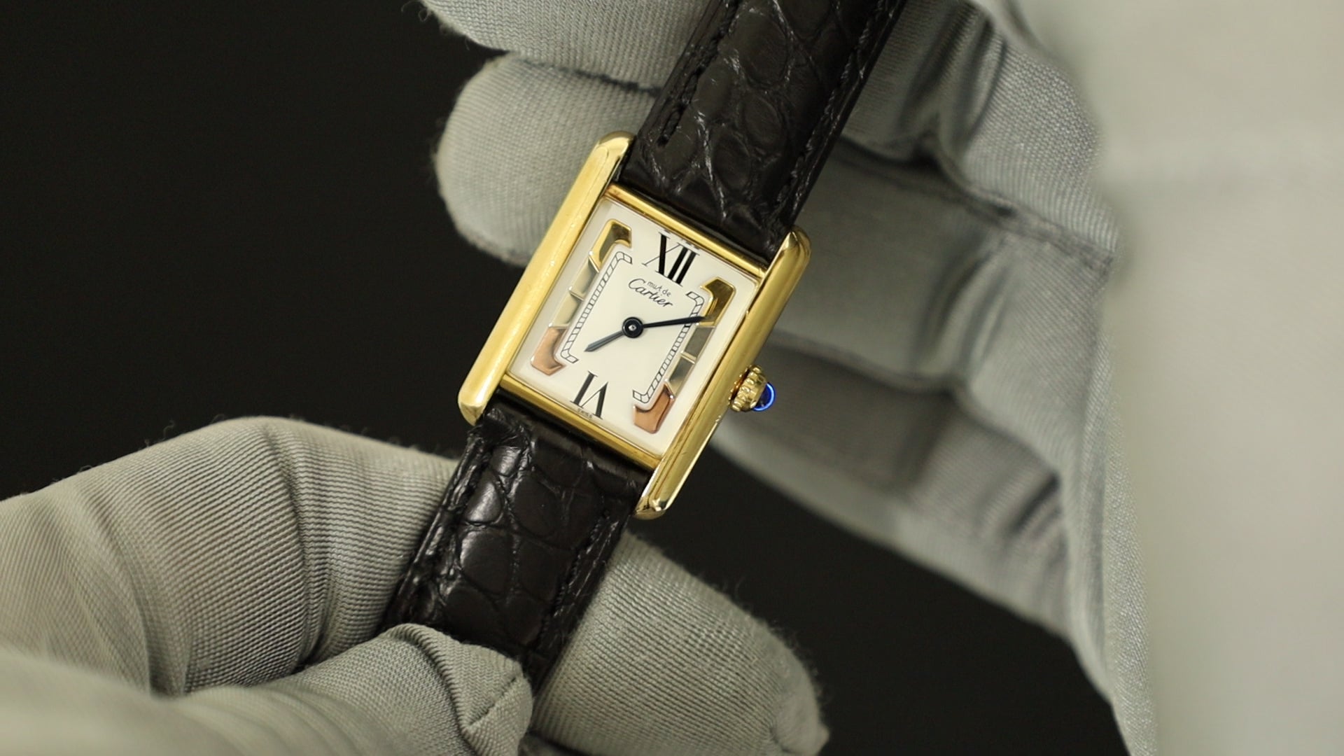 Cartier Must Tank SM 5057001 Quartz Cal. 057 SV925 Leather Strap with Genuine GP Buckle, Trinity Dial, Box, Dust Bag, Booklet, Warranty Card (1995) Overhauled