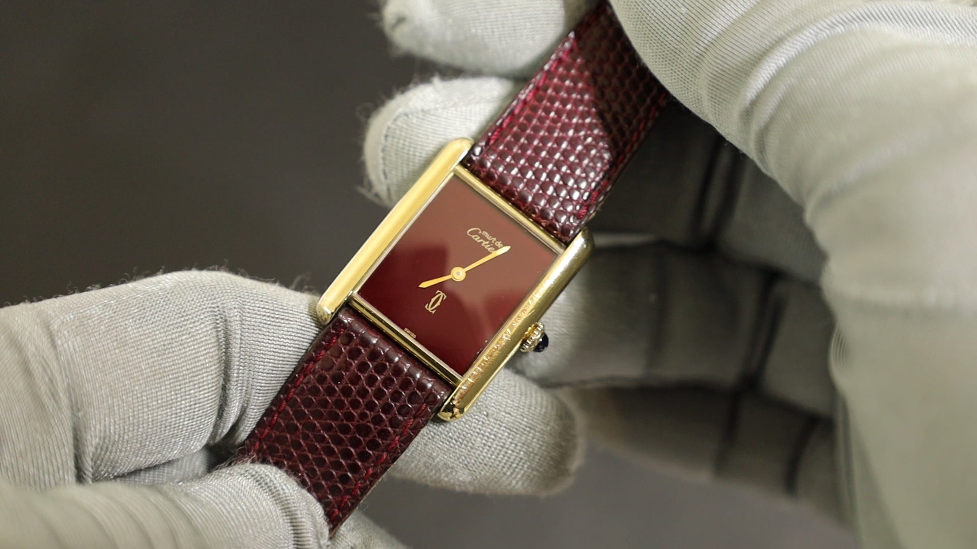 Cartier Must Tank LM, manual winding, Cal. 78-1, SV925, original leather strap, original pin buckle (GP), garnet dial, Bordeaux dial (SWISS marking), recently overhauled.