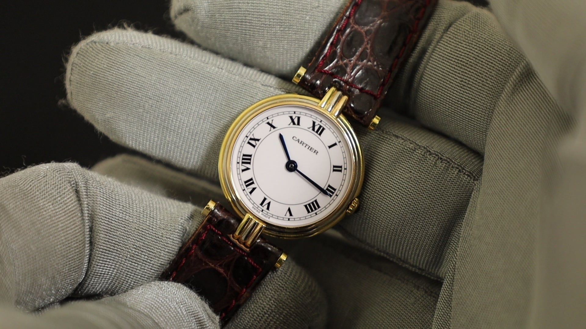 Cartier Vendôme Trinity VLC SM 81004 Quartz Caliber 690 750 with genuine leather strap and genuine buckle (GP). White Roman dial with genuine strap. (Unused) Overhauled.