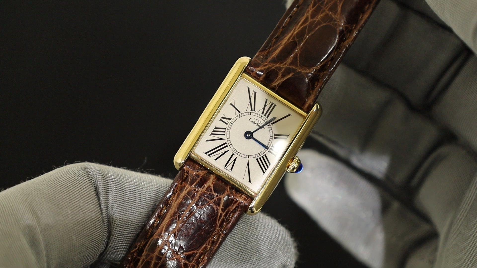 Cartier Must Tank LM W1005654 / 590005 Quartz Caliber 90 SV925 Leather Strap with Genuine GP Buckle, Opalescent Dial, Overhauled