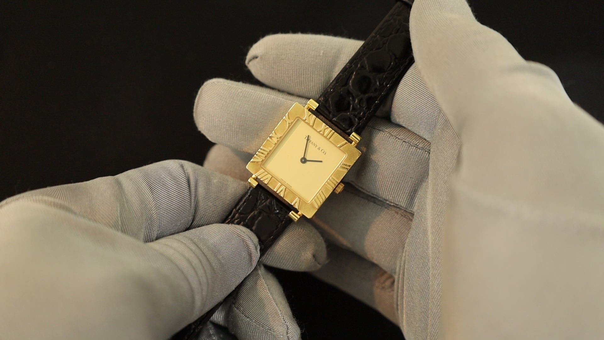 Tiffany Atlas Square T976 001 L3630 Quartz Cal.976.001 750 Leather Genuine buckle (GP) Gold dial Box Case Booklet Warranty (1996) Overhauled