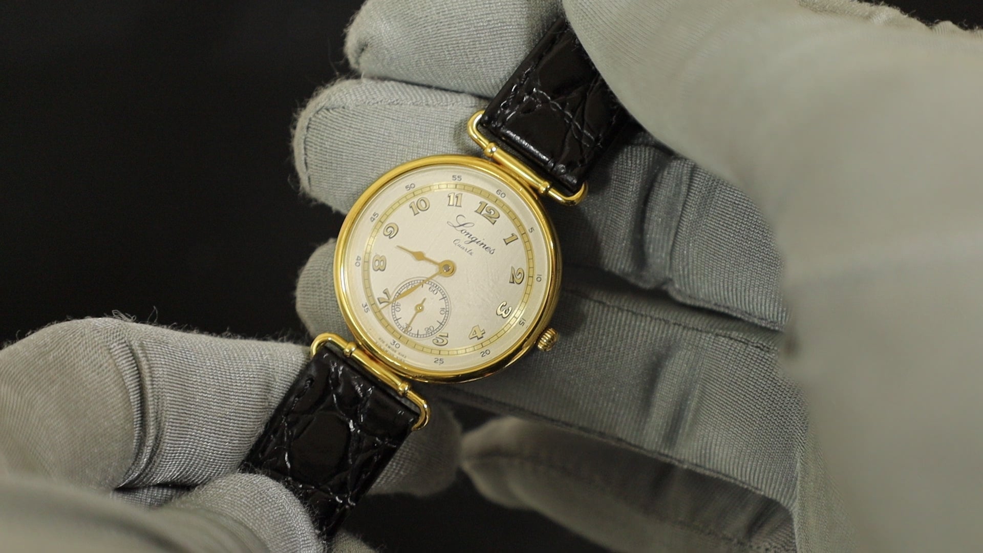 Longines 150th Anniversary Model 976.5162 Quartz Caliber L976.2 Stainless Steel/GP Leather Strap with Genuine GP Buckle, White and Gold Dial, Overhauled