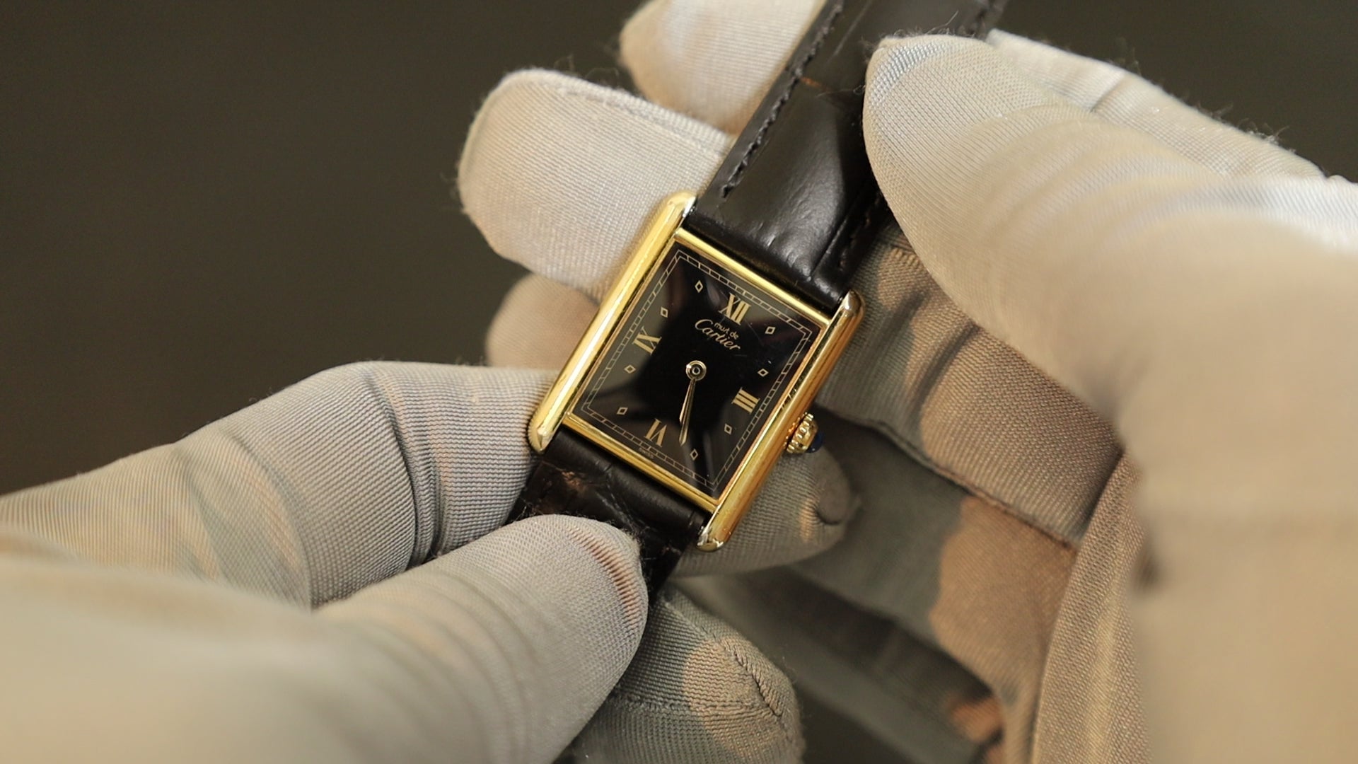 カルティエ マストタンク LM 590005 クォーツ Cal.90 SV925 革 純正Dバックル(GP)ブラック飛びローマン文字盤オーバーホール済み