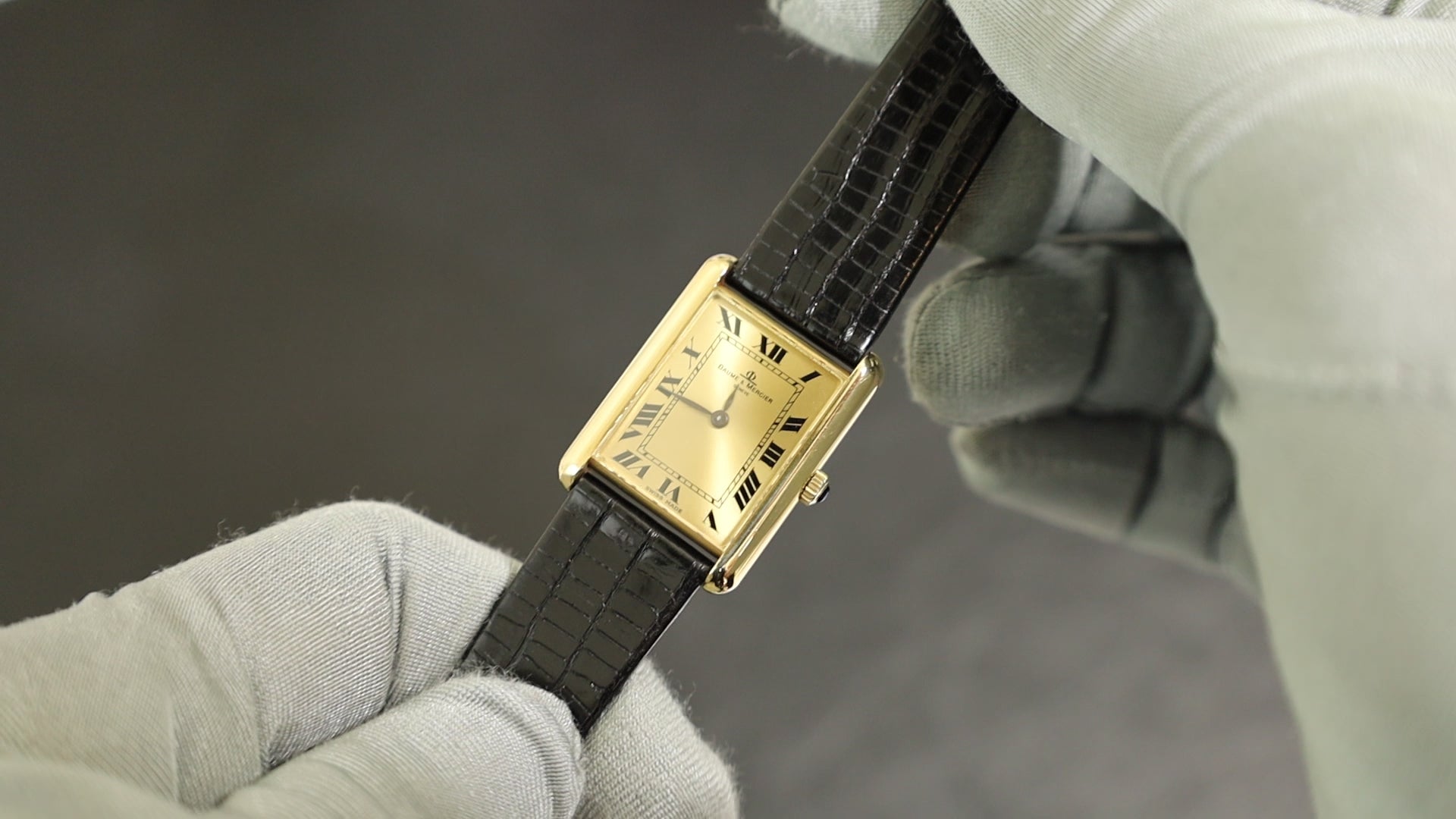 ボーム&メルシエ レクタンギュラー 37077 手巻き 750YG 革 純正ピンバックル(GP)シャンパンローマン文字盤 オーバーホール